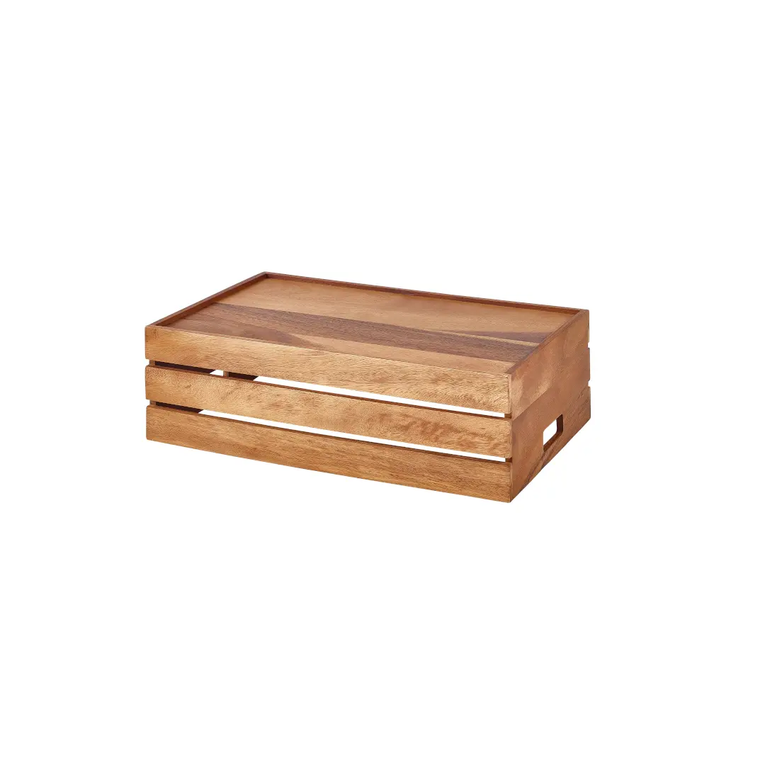 The Acacia Wood Crate / Riser GN 1/1 is made from strong and durable acacia wood, giving a premium look and long-lasting use. It can be used as a crate to hold items or turned over to function as a riser for food display.