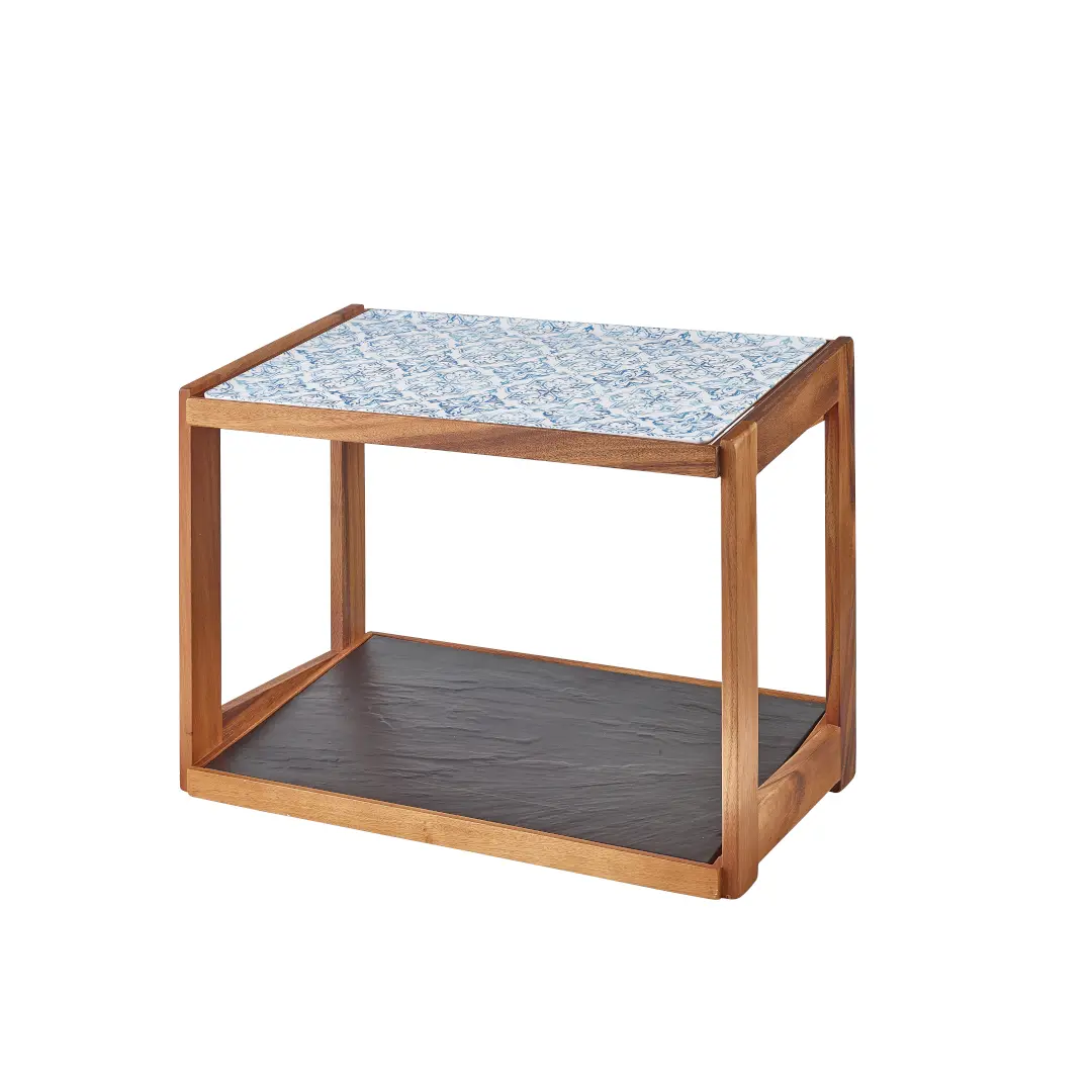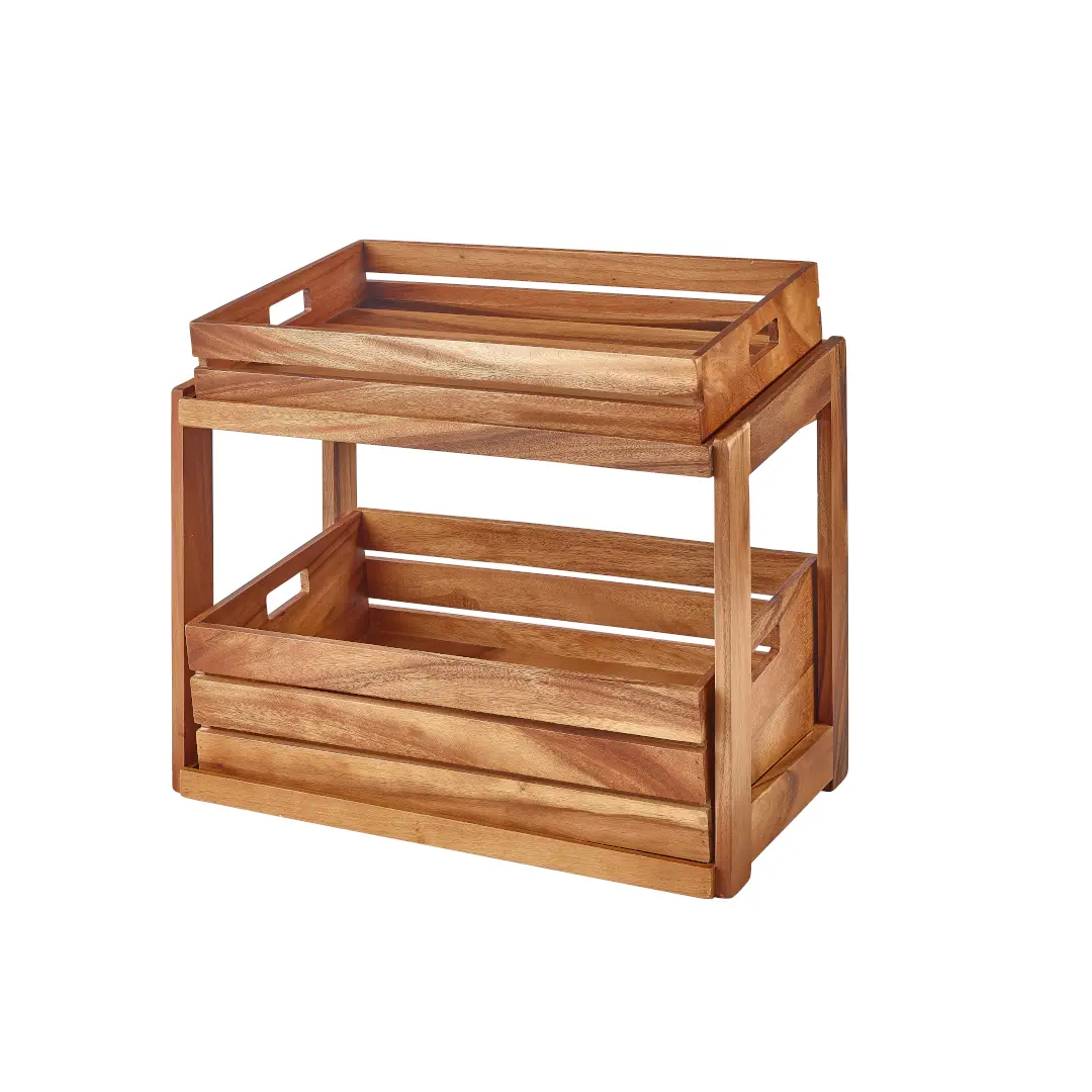 The solid acacia wood construction provides durability, while the two-tier design allows for organised and accessible food presentation.