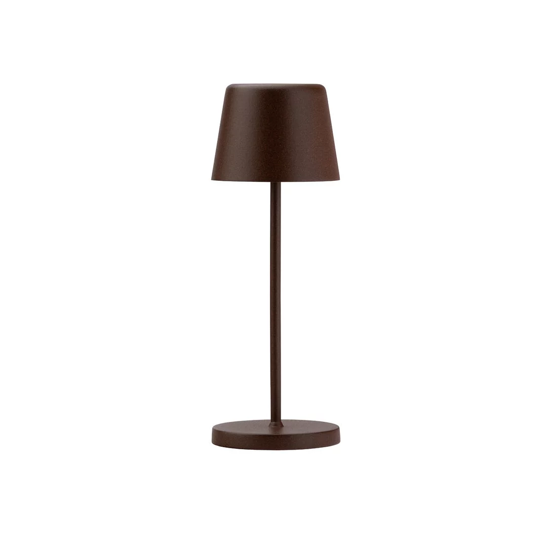 The lamp features a die-cast aluminium body finished in Corten, delivering a warm, industrial look that suits both contemporary and rustic environments. Its IP65 rating provides resistance to dust and water, making it suitable for indoor and outdoor use. Powered by a rechargeable Li-ion battery, it delivers up to 9 hours of runtime, with recharging made easy via the included individual charging base.