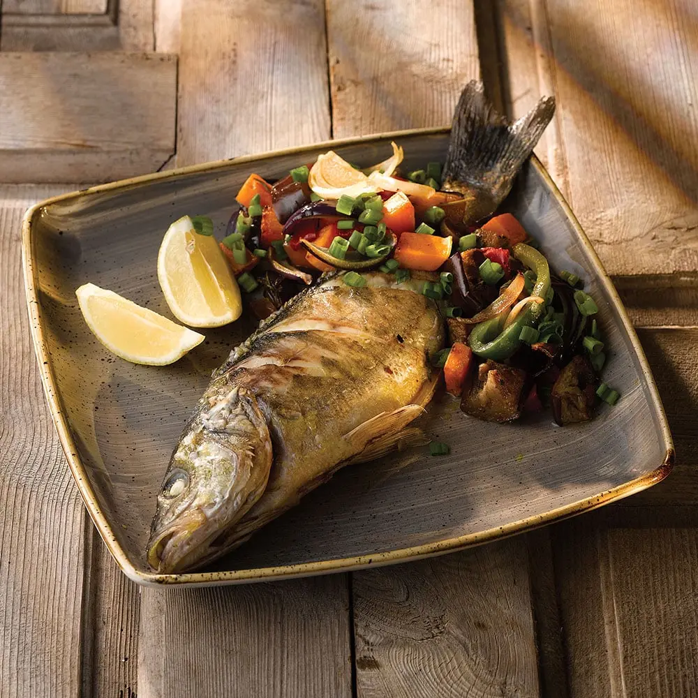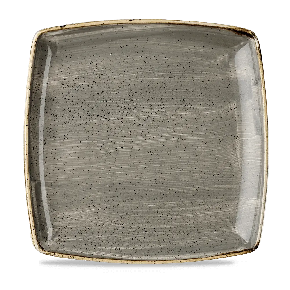 The Churchill Stonecast Peppercorn Grey Deep Square Plate 26.8cm combines rustic style with commercial durability.