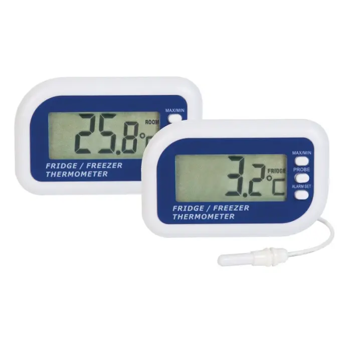 It includes programmable high/low alarms, max/min recording, and dual sensors that monitor both room and appliance temperatures.