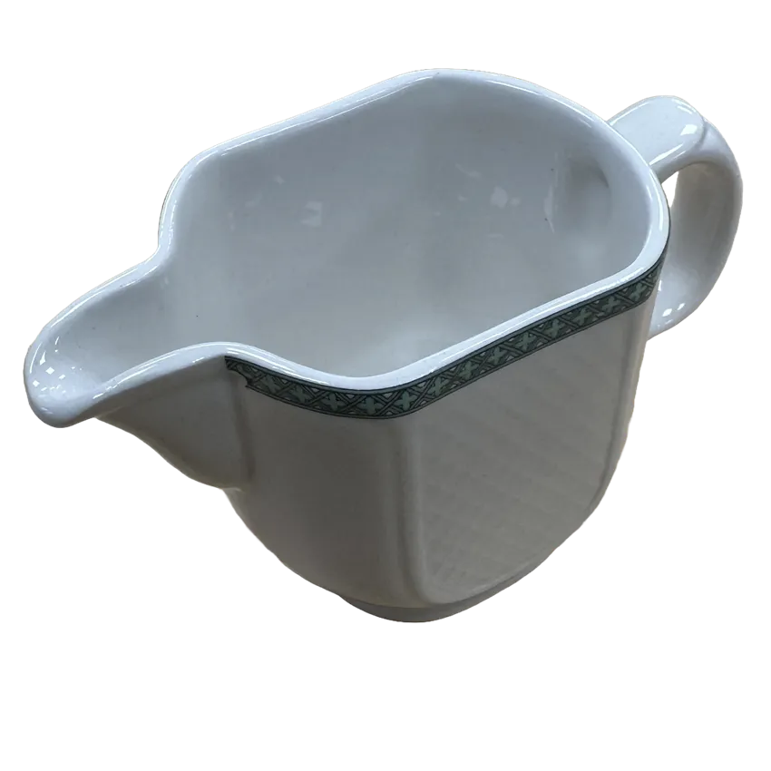 The Dudson Chantilly Milk Jug 9oz is designed for tabletop service. Ideal for milk, cream, and sauces. Manufactured from durable vitrified porcelain. Finished in white glaze with a green Chantilly border. Strong and practical for daily use. Suitable for professional hospitality environments. Supplied in cases of 12 jugs.
