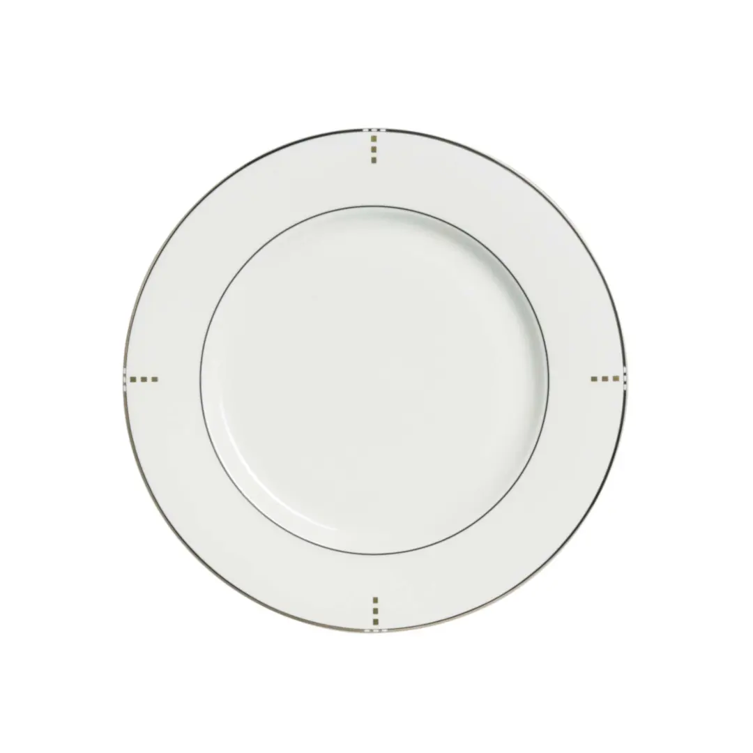 The plate features a soft white glaze with platinum banding and hand-painted gold square detailing.