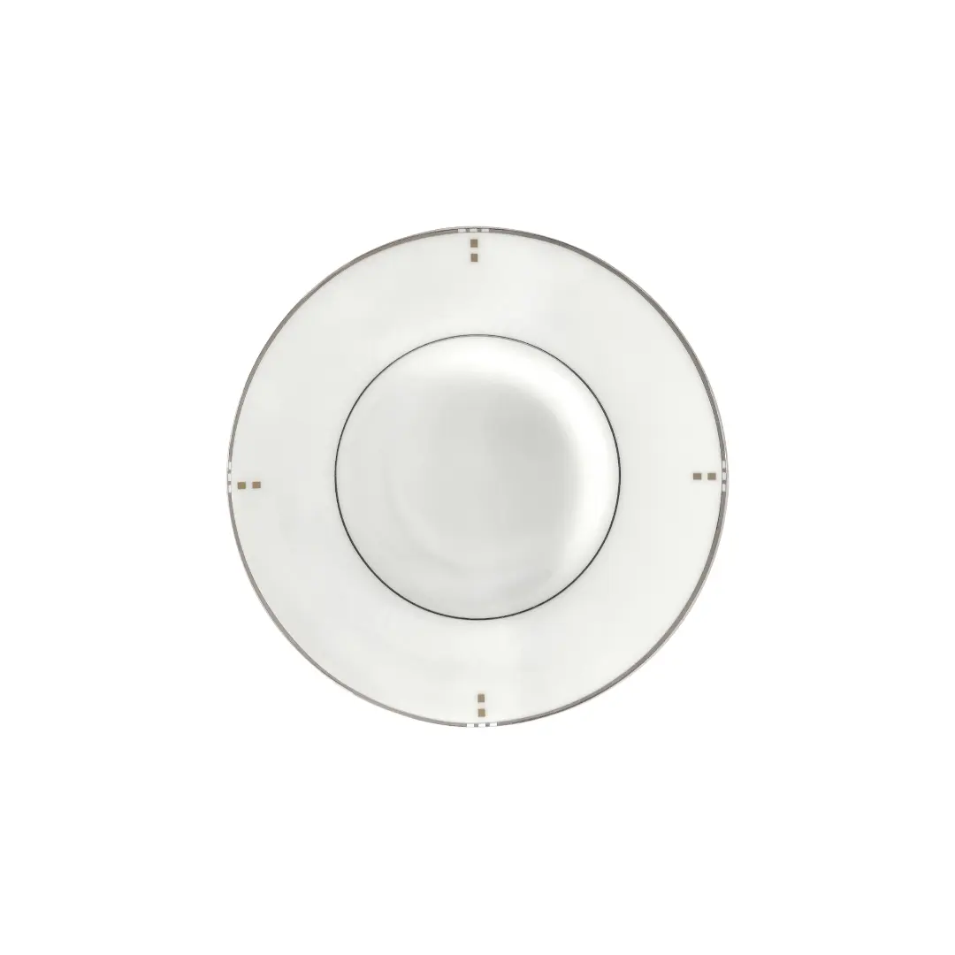 Finished in crisp white glaze with platinum banding and hand-painted gold square detailing.
