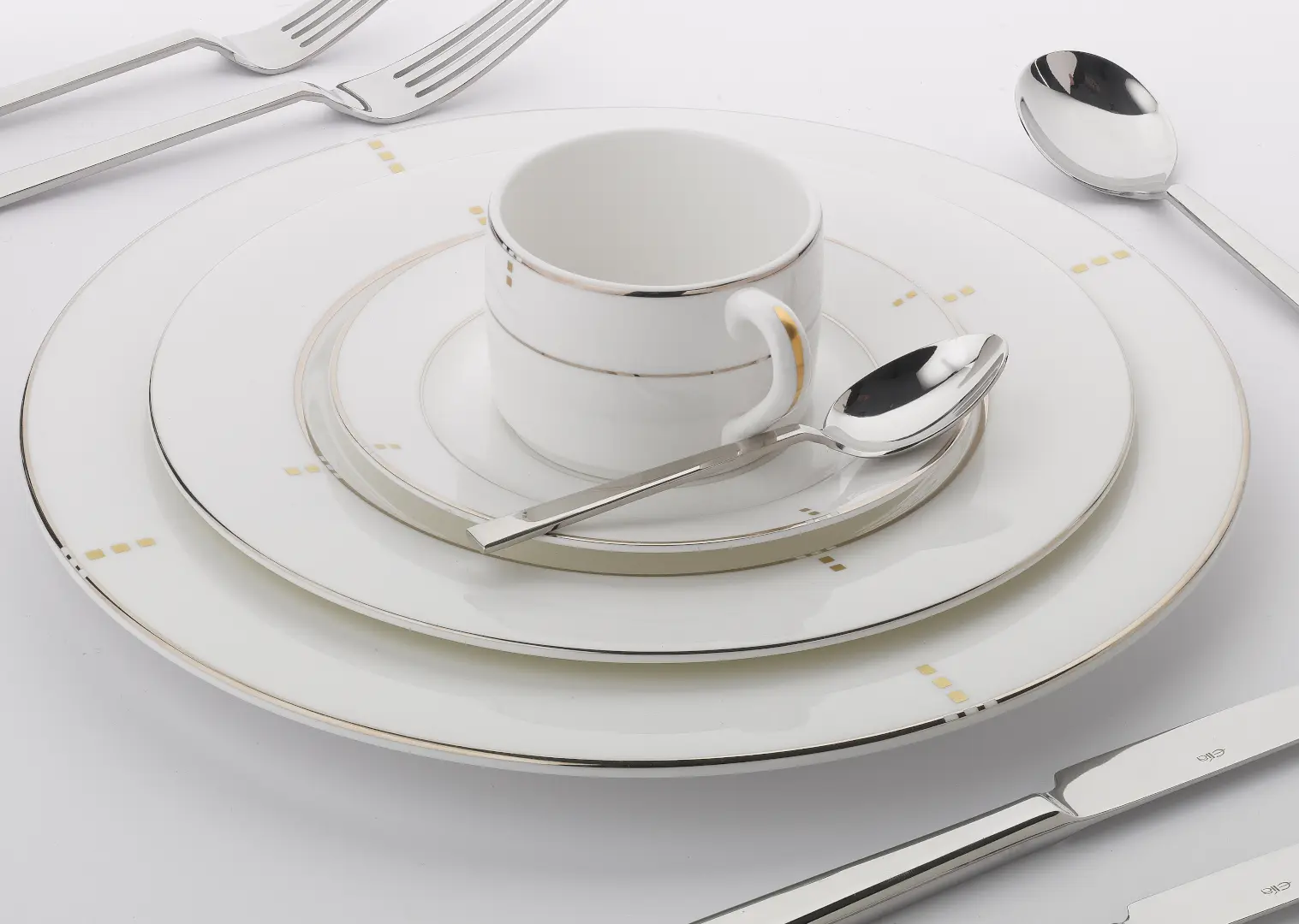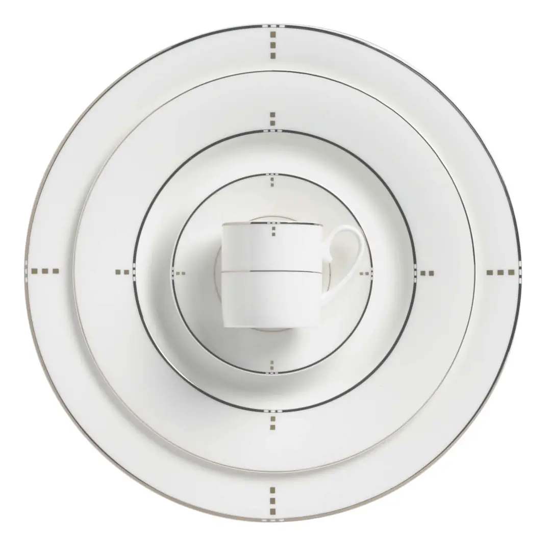Finished in white glaze with platinum banding and hand-painted gold square detailing.