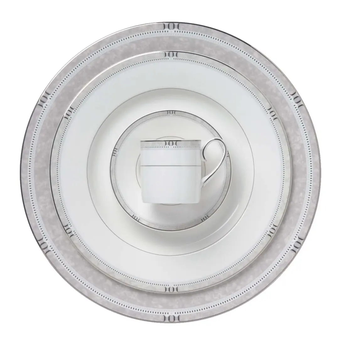 Finished in a soft white glaze with subtle grey marble effect and real platinum detailing.