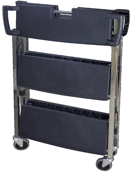 These foldable trolleys are a great space saving product, folding to half their width. Its very easy to fold these trolleys in half, simply lift the metal bar that sits in the middle of the top shelf and it folds effortlessly.