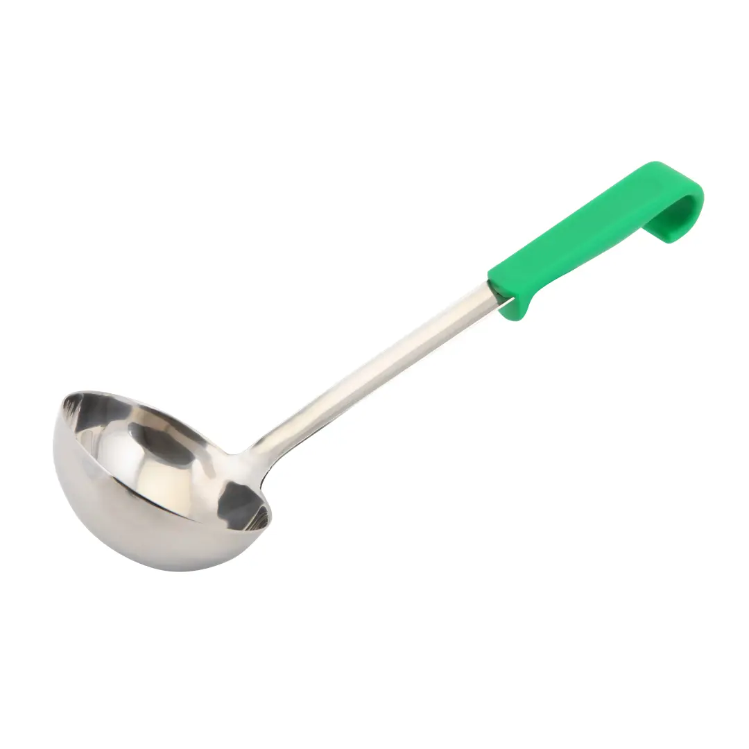 The Green Plastic Handle Soup Ladle is designed for durability and ease of use. This makes it ideal for hot buffet service.