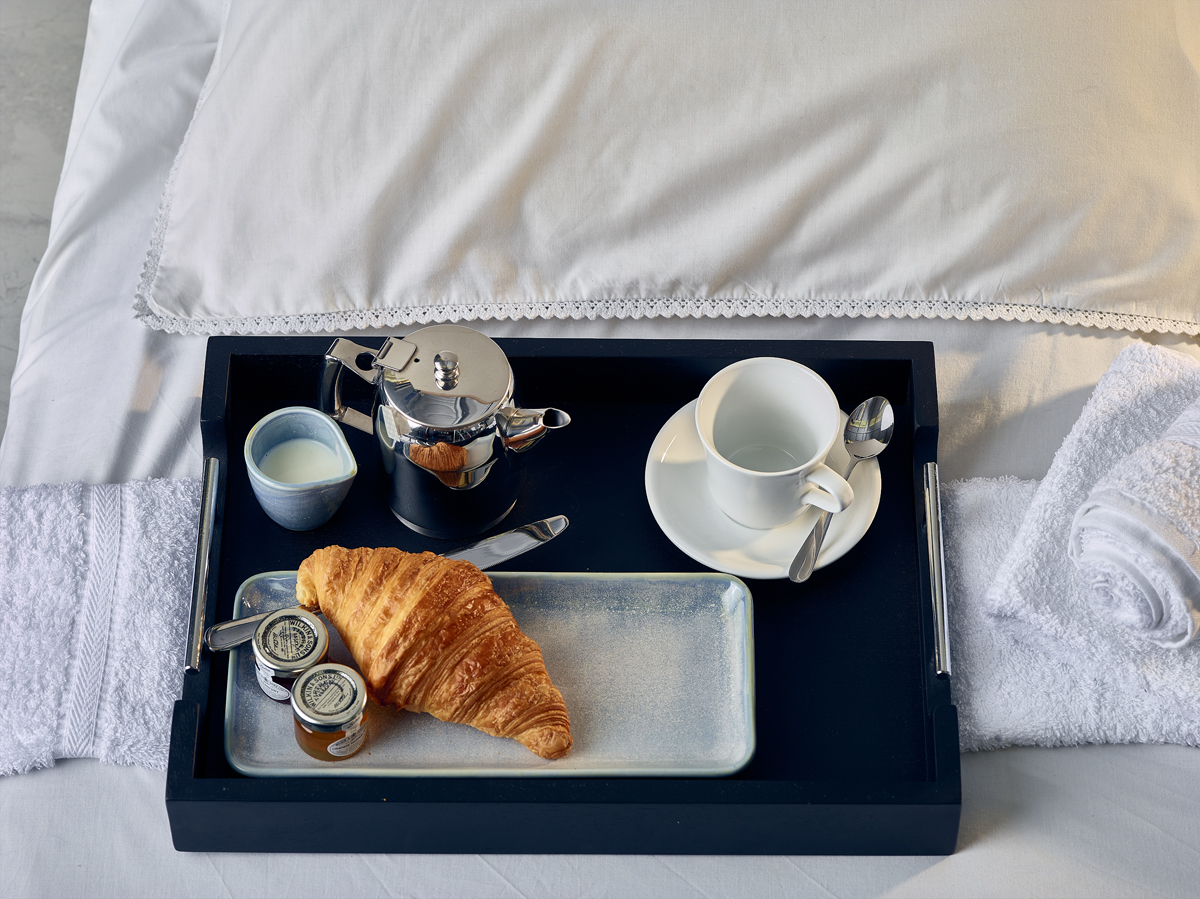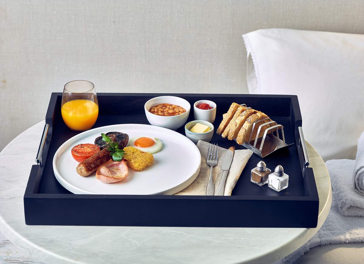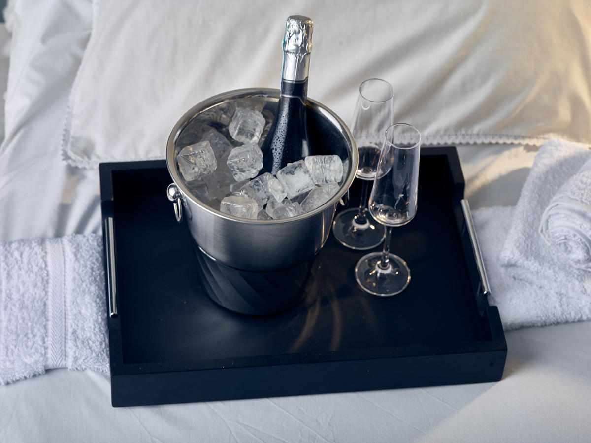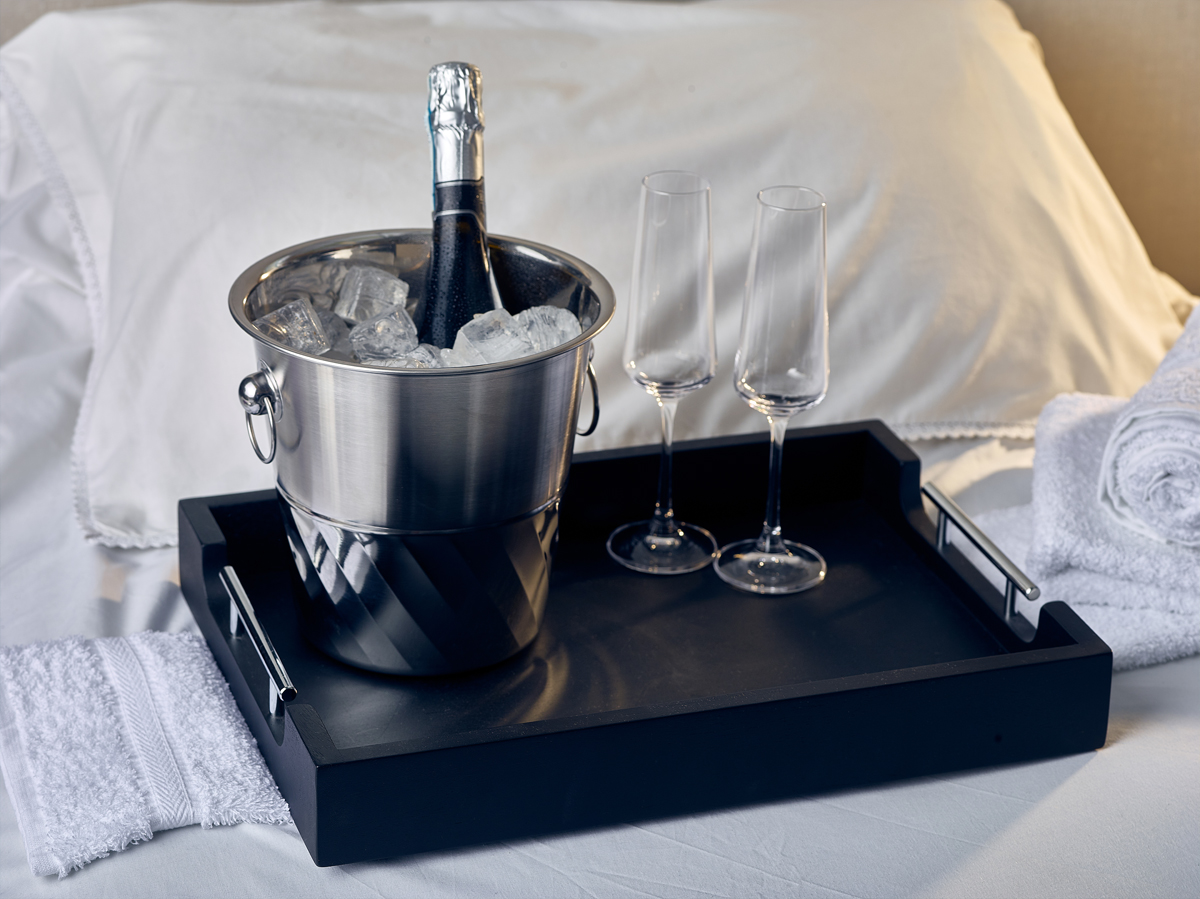 The 65 x 49cm Solid Black Butler Tray features stainless steel handles adding a premium feature, perfect for hotel room service.