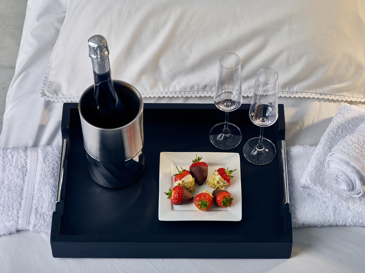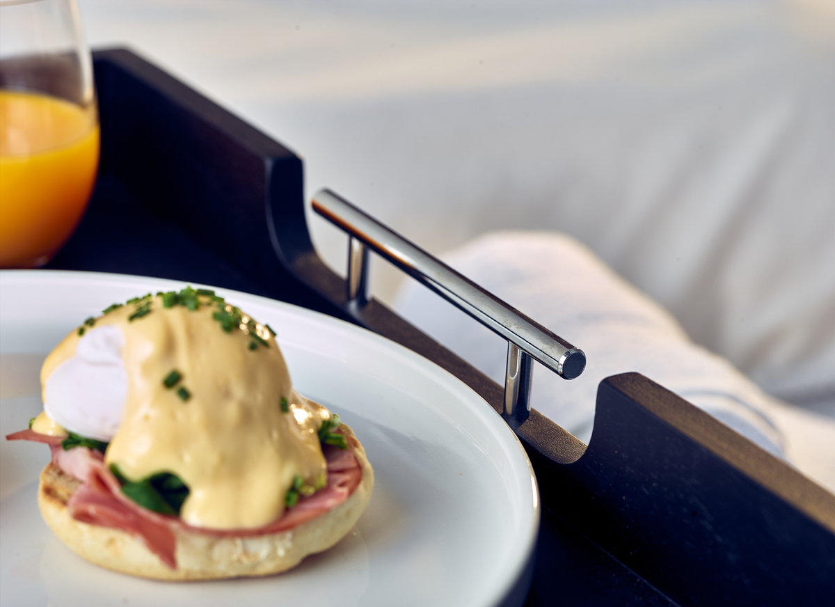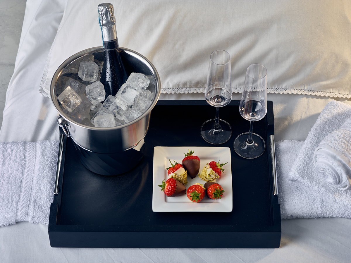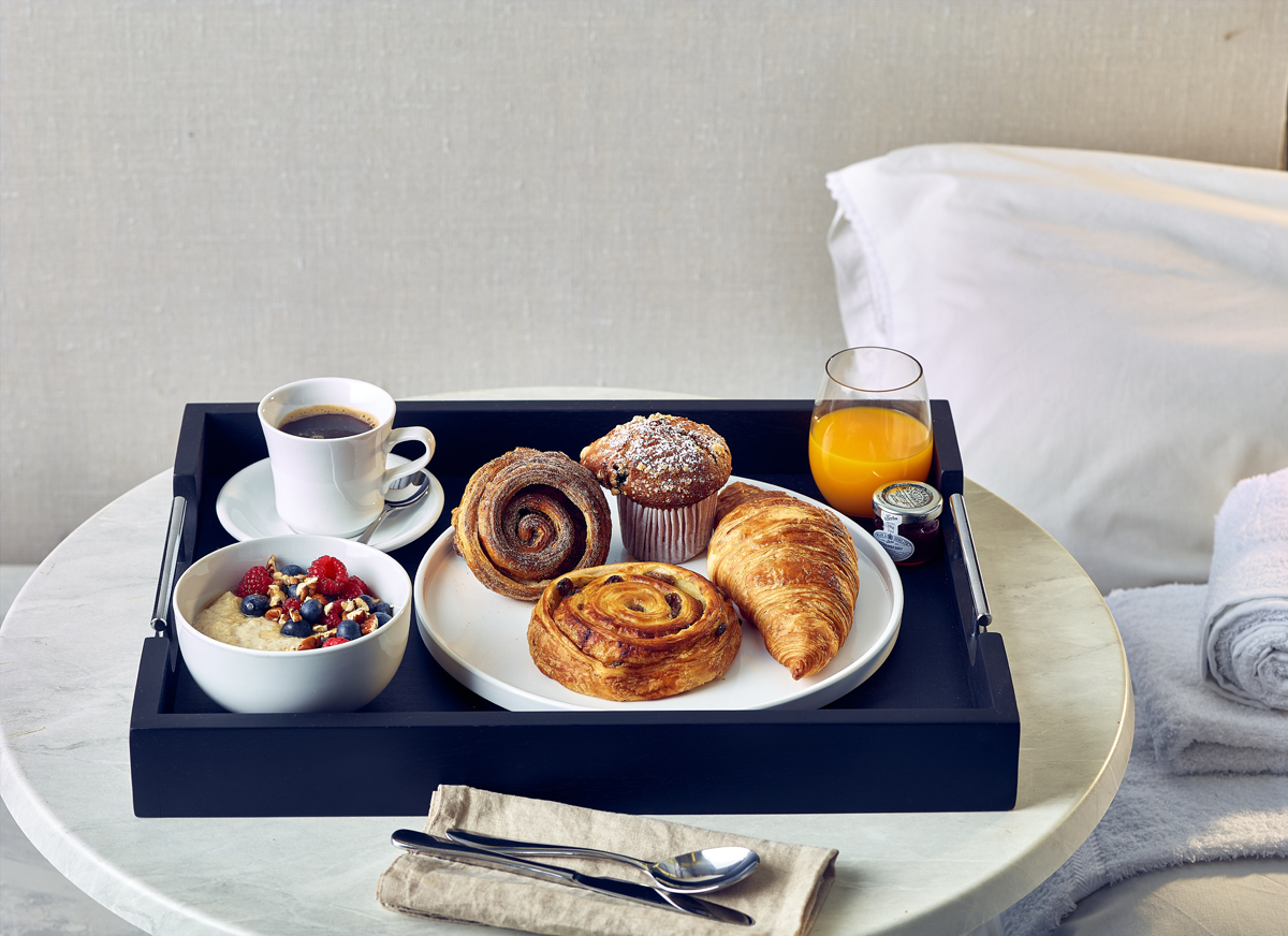 The 65 x 49cm Solid Black Butler Tray features stainless steel handles adding a premium feature, perfect for hotel room service.