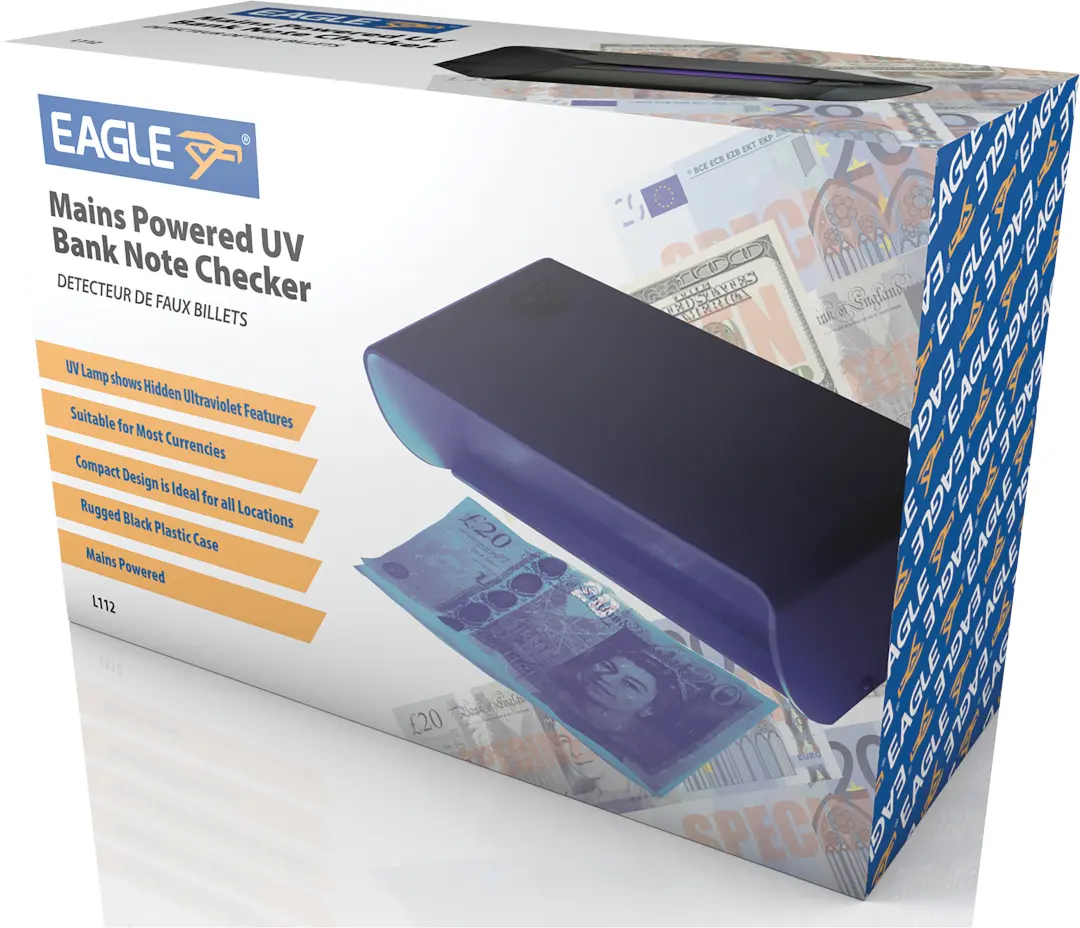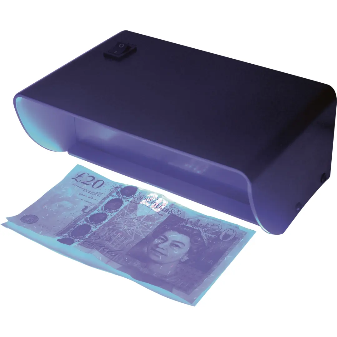Mains powered and easy to use. Simply place the note under the ultraviolet light to reveal hidden security features.